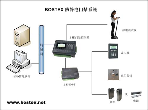 可编程逻辑控制器是整个系统的‘心脏’。它不仅实现了员工身份的自动识别,还完成与静电测试仪的系统联动。当卡片合法且静电测试通过后,可编程逻辑控制器上的继电器动作,驱动道闸,让员工通过。可编程逻辑控制器采用32位ARM9芯片和嵌入Linux操作系统开发而成,集成了PLC功能,该控制器具有一个与计算机通讯的485接口和一个TCP/IP网络接口,可存储10万张卡片和10万条记录。通过BS1000-5门端控制器,可实现与所有BOSTEX读卡器,包括按键读卡器和指纹读卡器的通讯。