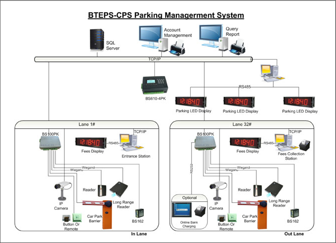 The whole system is make up of the following component: CPS Car Park Management System, CPS Car Park Server (BSPK-S), Car Park Controller (BS100-PK), Card Reader, LED Display etc. CPS Car Park Management System required to run on BTEPS platform and work in conjunction with CC, DAS and CS-CPS module. CS-CPS communication server is designed for CPS system in order to realize the data upload and download between CC Command Center and CPS Server/Controller.