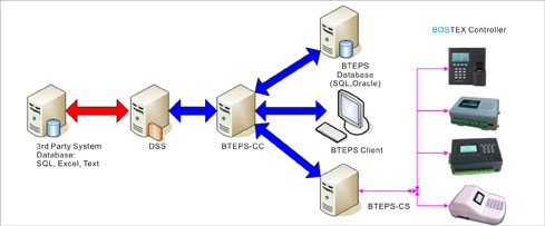 (1) Directly obtain the add, modify and delete user information from 3rd party SQL database and synchronize to BTEPS system via DSS Data Synchronize Server.