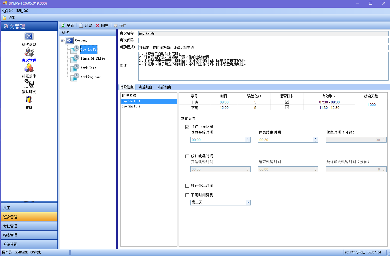 一个固定班次可包括多达5个时段,可为每个时段设置不同的考勤制度。根据需要,可设置上班或者下班是否要刷卡。如果设为不刷卡,统计时如果没有相应的刷卡记录,则自动计算为正常出勤;如果存在有效刷卡记录,则按实际刷卡时间计算。