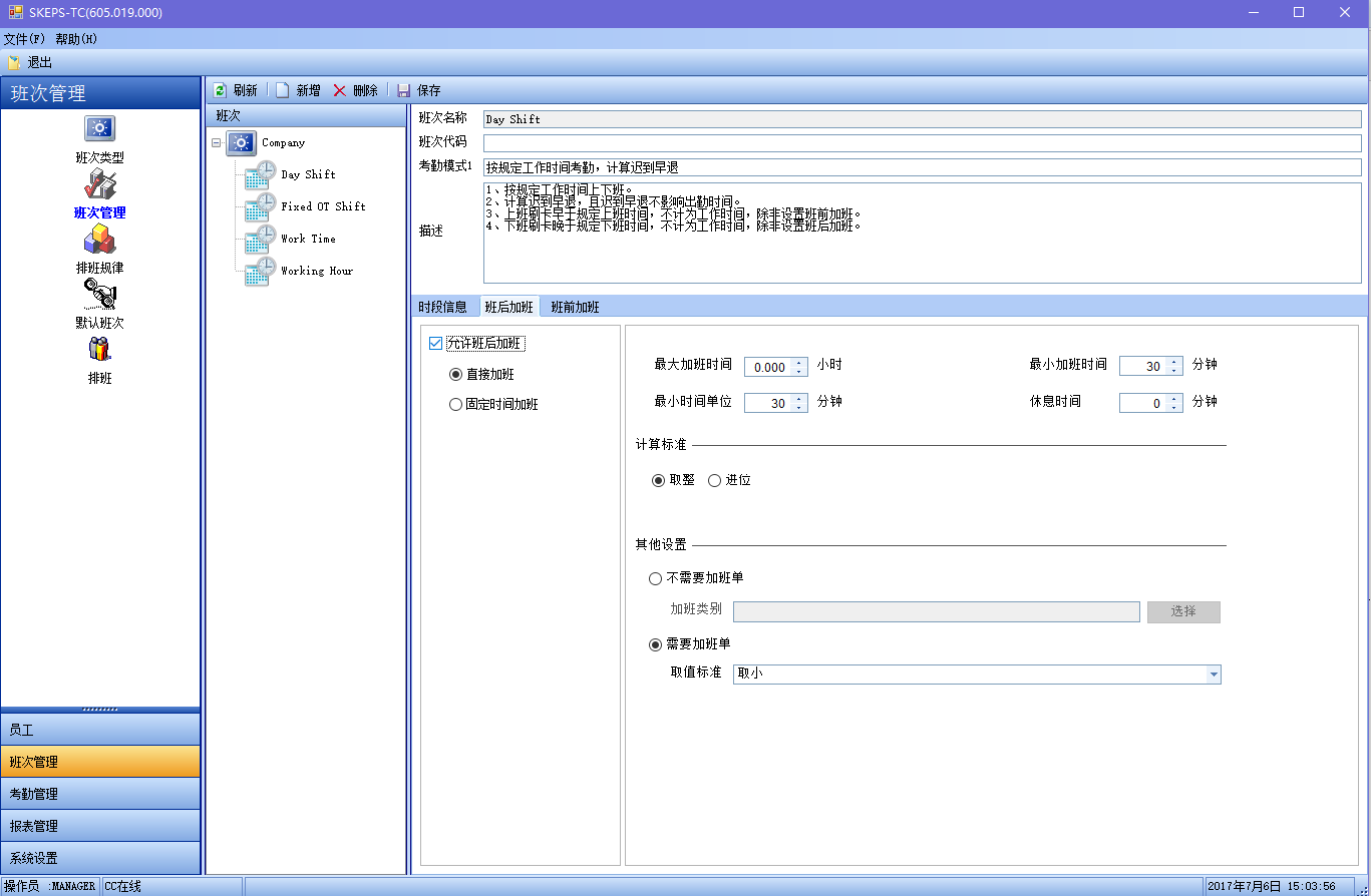 (1) 班前加班和班后加班。通过系统参数,可以设置最后的统计结果是按照加班单上的加班时间还是按照实际刷卡考勤的加班时间来计算。