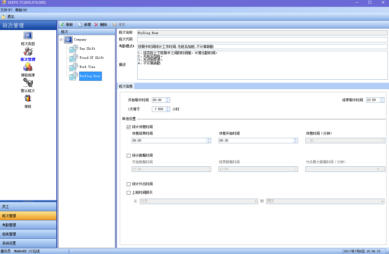 TC考勤管理系统同时支持固定班次和弹性班次。固定班次是指员工每天按照某一个固定的上下班时间来刷卡,没有在规定的上班或下班时间刷卡都计为缺勤。在固定班次中,可选择按规定的上班时间考勤(如8小时),还是按实际的刷卡时间考勤(超出8小时的部分计为加班)。