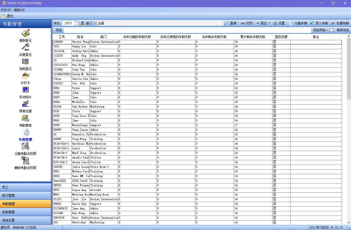 TC考勤管理系统具有年假管理功能,对给每个员工分配一定的年假。每年的年假只能分配一次,已经分配当年年假的员工不能再次分配。可单个或批量给员工登记年假,登记年假在登记请假界面上操作。登记年假时首先扣除上一年未使用完的年假,再扣除本年度的年假。