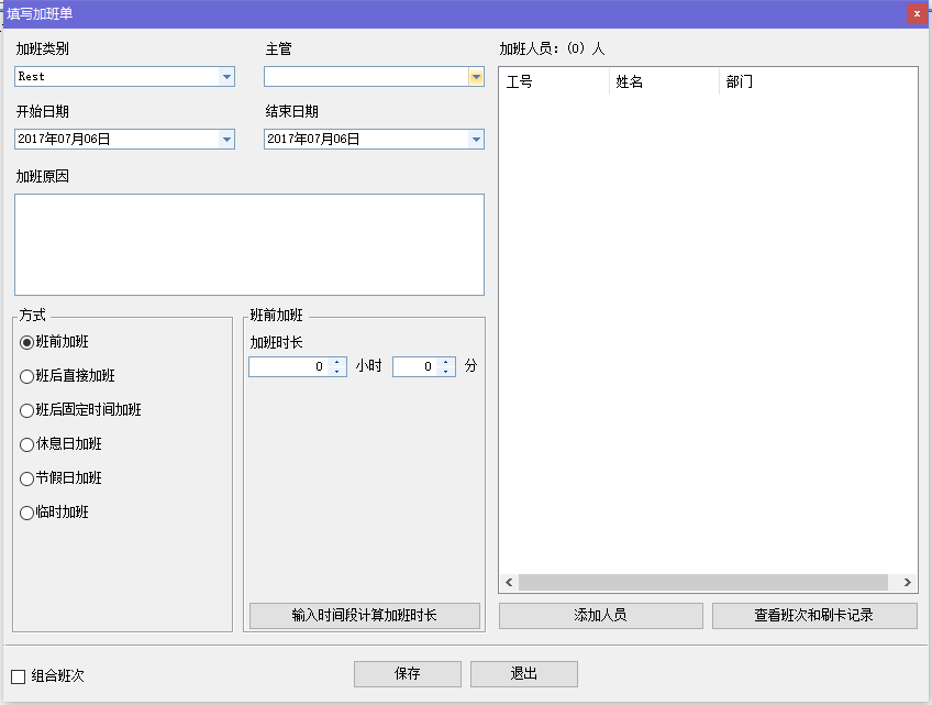 (3) 临时加班。直接登记某一天的某个时间段为加班时间。可手动输入加班时间长度和加班单位(小时或天数)。