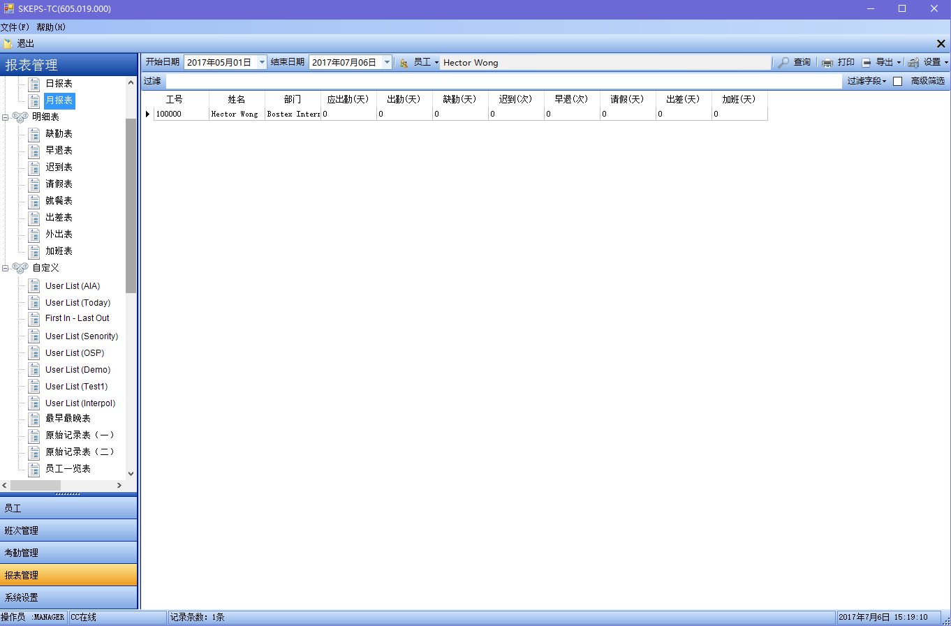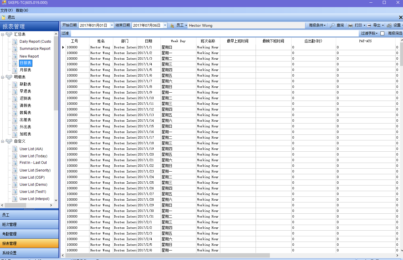 考勤统计报表是TC考勤管理系统的一大特点。除了可提供日报表、月报表、原始记录表、分类明细表外,用户还可自定义要显示和打印的字段。所有考勤报表均可导出到一个电子表格。