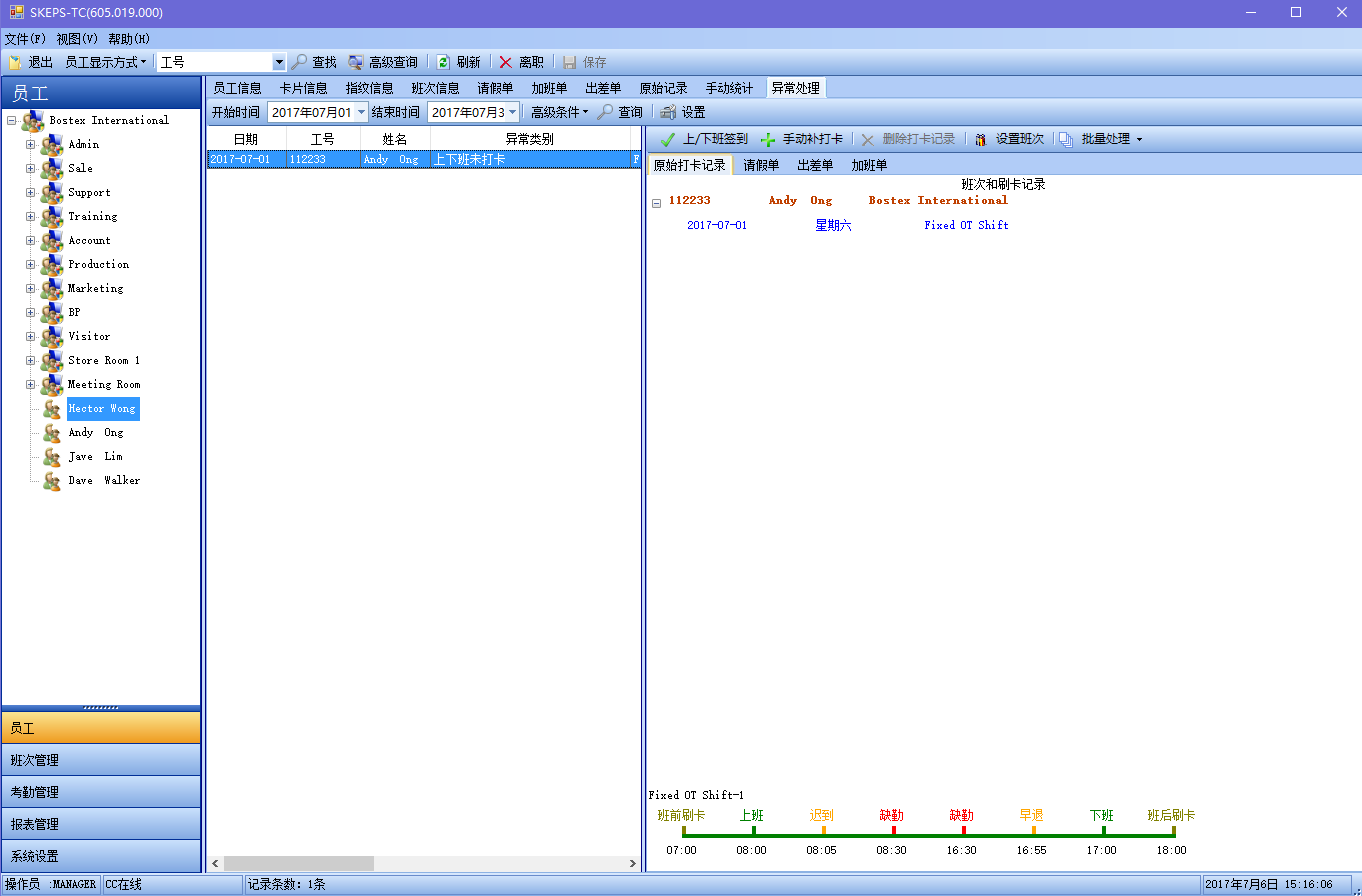 TC考勤管理系统具有考勤异常处理功能,即在统计之后能够显示所有缺勤的统计资料,在这里,用户可以确认缺勤原因,检查班次是否正确、是否有相应的刷卡记录。通过手动添加一条刷卡记录并重新统计可消除异常记录。当选择某条异常记录时,能够同时显示该员工在当天和第二天的所有考勤刷卡记录,以供操作员查阅。可以按日期时间查询和打印考勤异常记录。