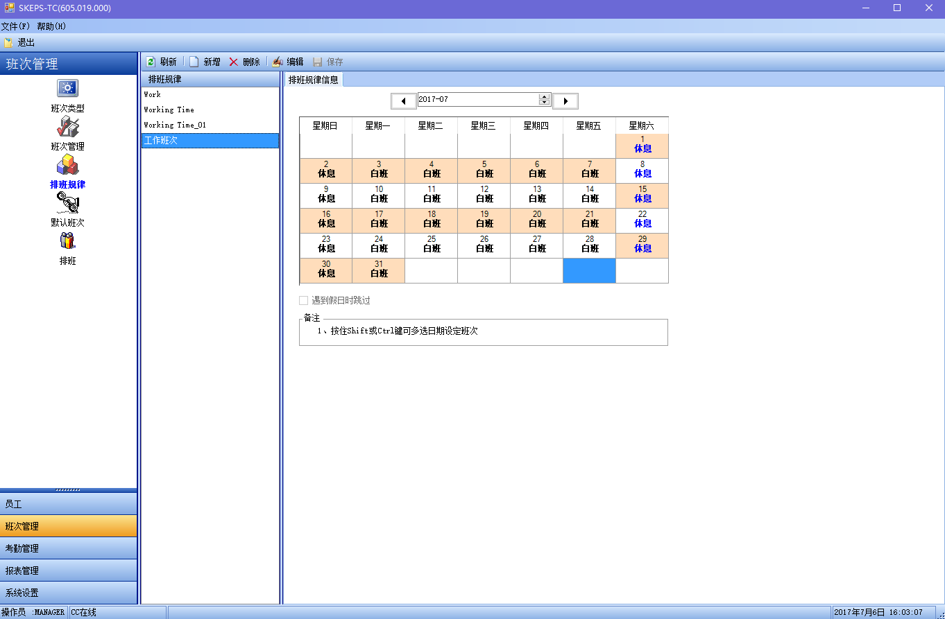 若干个班次按照一定的先后次序组成一个排班规律。将排班规律分配给员工,称之为排班。当发生调班时,可手动设置某一天的班次。在统计中,手动设置的班次,其优先级要高于自动排好的班次。系统自动给节假日分配一个休息日班次。