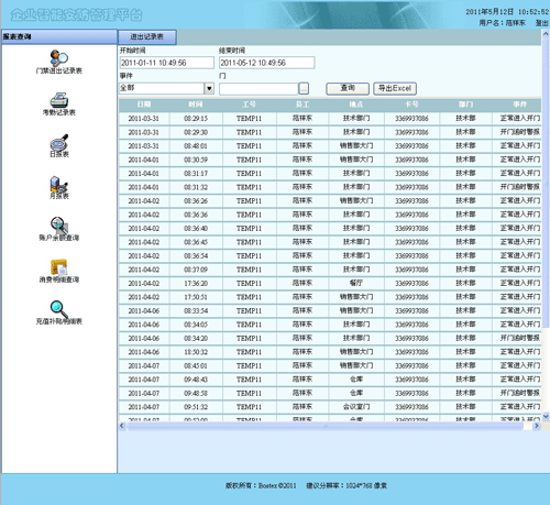 操作员通过IE浏览器,查看或实时监控本部门员工的进出刷卡记录,并可将进出记录导到电子表格,而不用安装复杂的MS报警监控软件。